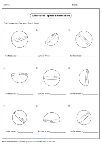 PDF Volume - Sphere & Hemisphere ES1 - Math Worksheets 4 Kids Printable Math Worksheets @ Find the exact volume of each shape. 10) A spherical ball has a radius of 6 centimeter. ... Volume - Sphere & Hemisphere ES3 Answer Key 48 m t 42 m 72 in 27 in 33 cm 78 ft 60 m 45 in. Name : Score : Printable Math Worksheets @ Find the volume of each shape ...